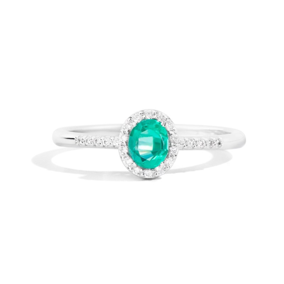 Anillo colección Iris Esmeralda en oro blanco de 18kts con diamantes naturales y una esmeralda oval natural.