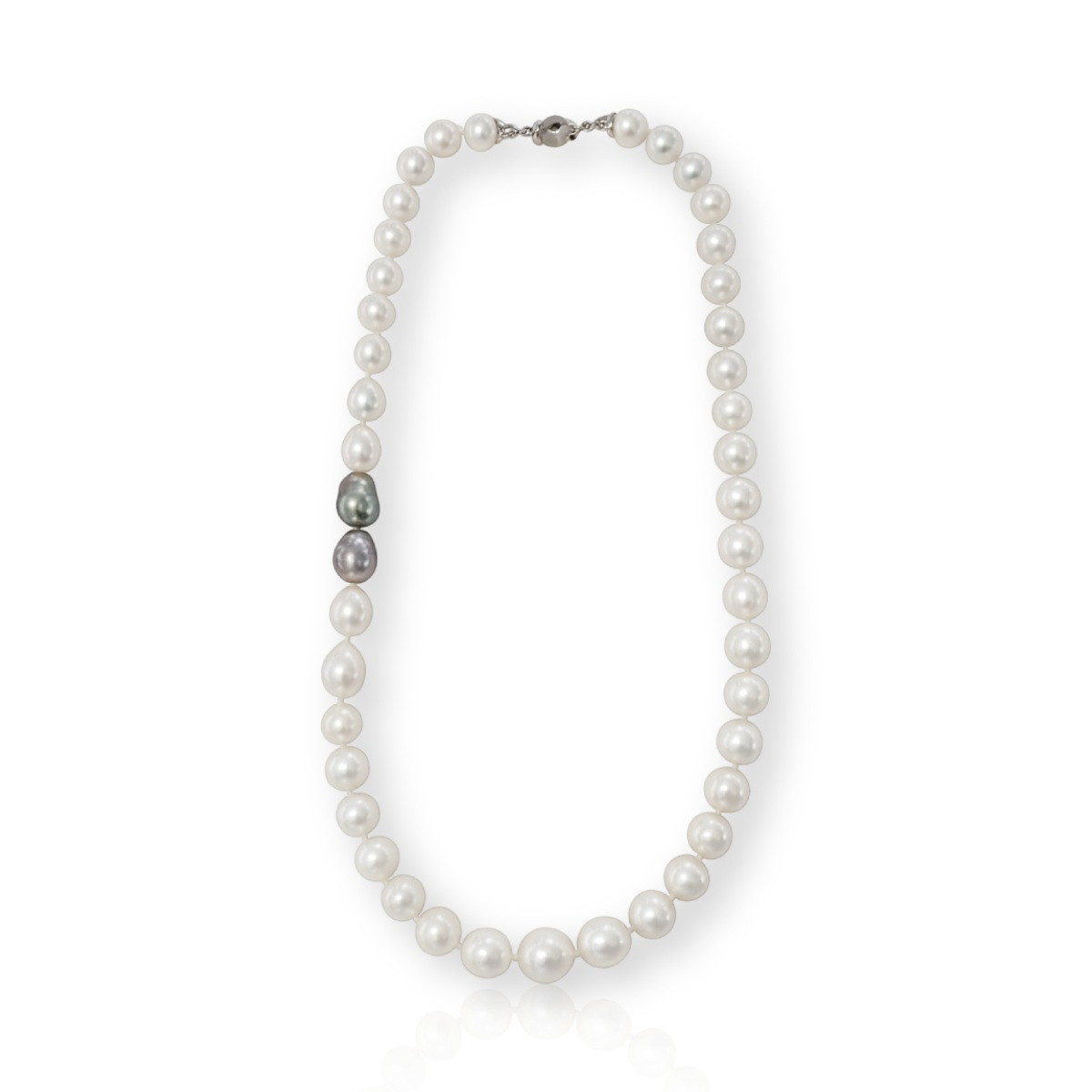Collar colección Pearls en oro blanco de 18kts con 41 perlas blancas australianas combinando esféricas y semibarrocas más 2 perlas tahití barrocas.