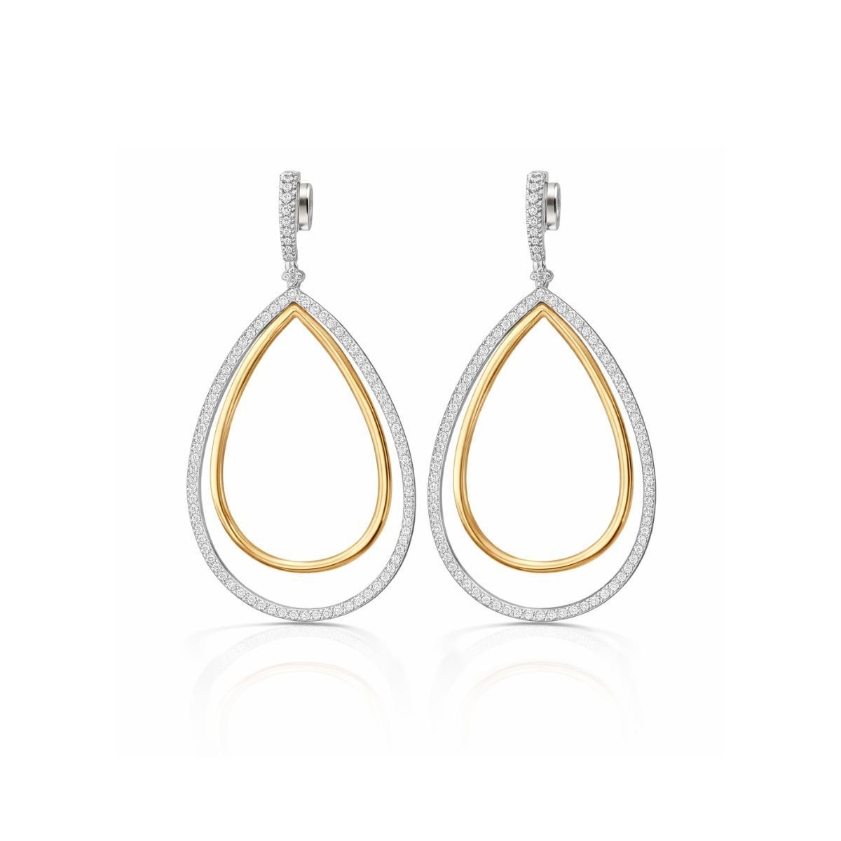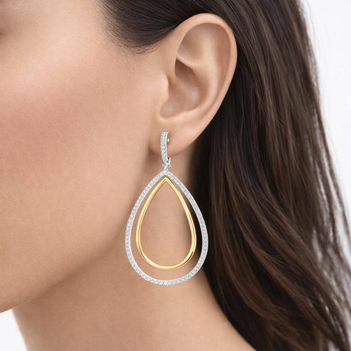 Descubre estos pendientes en oro rosa y oro blanco de 18kts con diamantes naturales, diseñados para aportar luz, elegancia y movimiento.