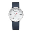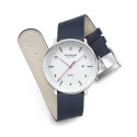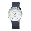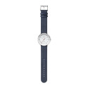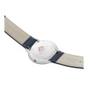 La colección Doppio combina tradición e innovación en un diseño audaz y sofisticado. Caja de acero pulido de 41 mm con mecanismo solar, cristal de zafiro doble cúpula y correa azul de piel vegana. Esfera cóncava con el icónico segundero rojo inspirado en los relojes ferroviarios suizos. Logo histórico de 1951 grabado en el fondo, homenaje a su herencia suiza.
